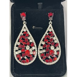 Boucles d'oreilles pendantes de forme ovale en métal antiallergique et strass coloris blanc et rouge. Longueur : 7 cm environ. Le produit sera livré dans sa boîte de présentation