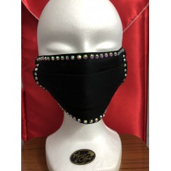 Masque barrière 100% coton coloris noir avec couture centrale au niveau du nez, agrémenté de strass AB, bleu ou rouge . Elastique qui passe derrière la tête. LIVRE SOUS EMBALLAGE PLASTIQUE ET AVEC SA POCHETTE DE RANGEMENT.